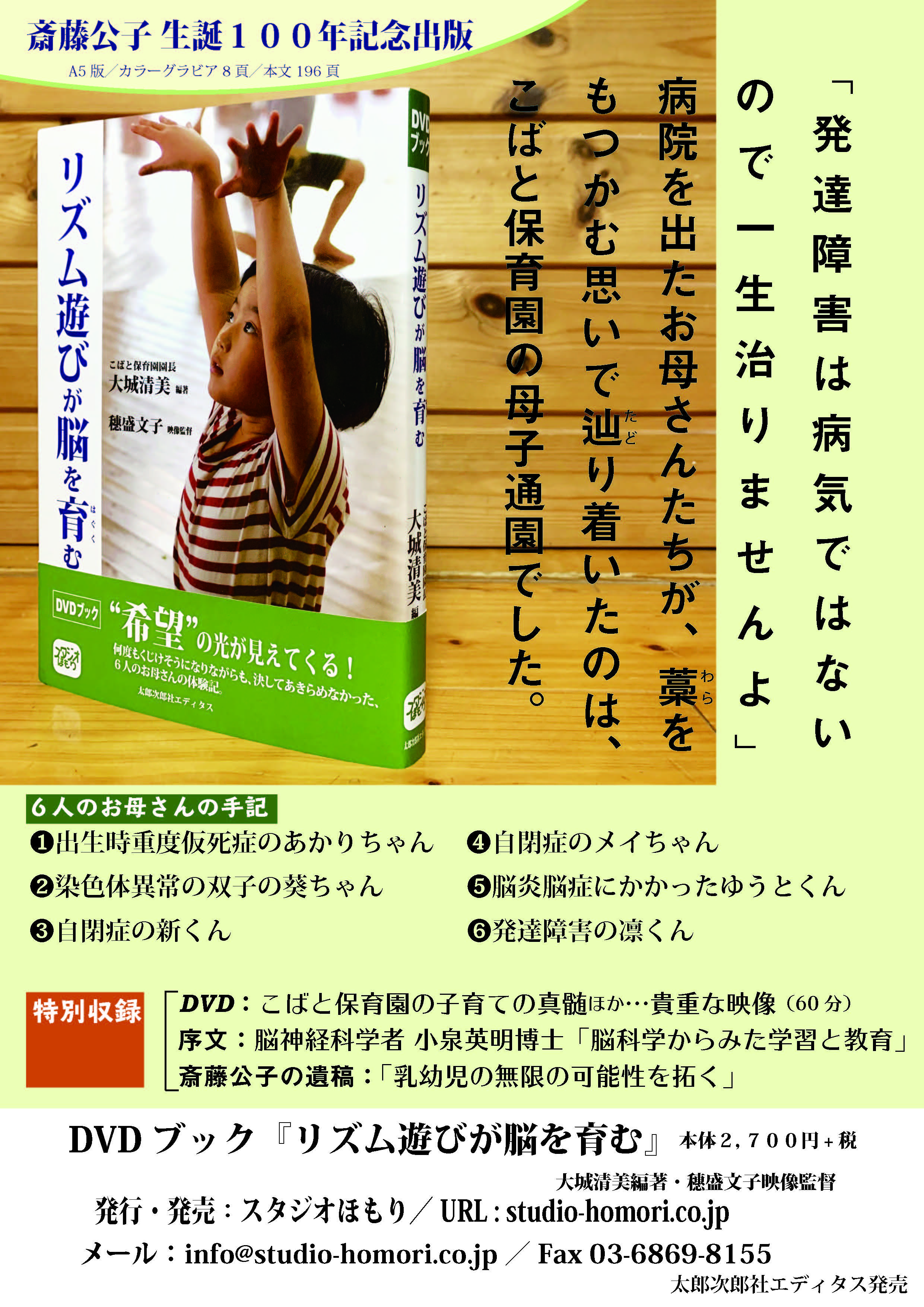 「斎藤先生の保育実践は、諦めないで続けることで、どんなに大変な生まれの子どもでも必ず変わる、希望の保育です。 私が斎藤先生のもとで一年間勉強した1981年から先生が亡くなる2009年までの約28年の間に、「斎藤公子のリズム遊び」は目まぐるしく変化し続けました。それは進化でもあり、また、弱さを持って生まれてくる子ども達が年々増えていく中で、どの子も笑顔にしたいと試行錯誤しながら考え続けた結果だと思っています。年長リズムには華やかで楽しいものがたくさんあります。けれども晩年の先生は、基本のリズムをとても大事にしていました。先生の沖縄での保育講座において、参加者から「リズム遊びはどれくらいやったらいいのですか?」という質問をよく受けました。先生は「私は朝に晩に、リズム遊びをしているんですよ。」と、答えていました。先生が亡くなった今、それを思い出して、私の園でも午前・午後、毎日2回リズム遊びをするようにしています。こばと保育園では親指の蹴りが出ない子も、うんと手をかけ、待って待って、自らの力で足の親指の蹴りが出るまで根気強く保育を続けることで、生まれの弱さを克服してみんな元気に育って行きます。ですから0歳から年長まで一番丁寧に行うのは「ハイハイ運動」なのです。」